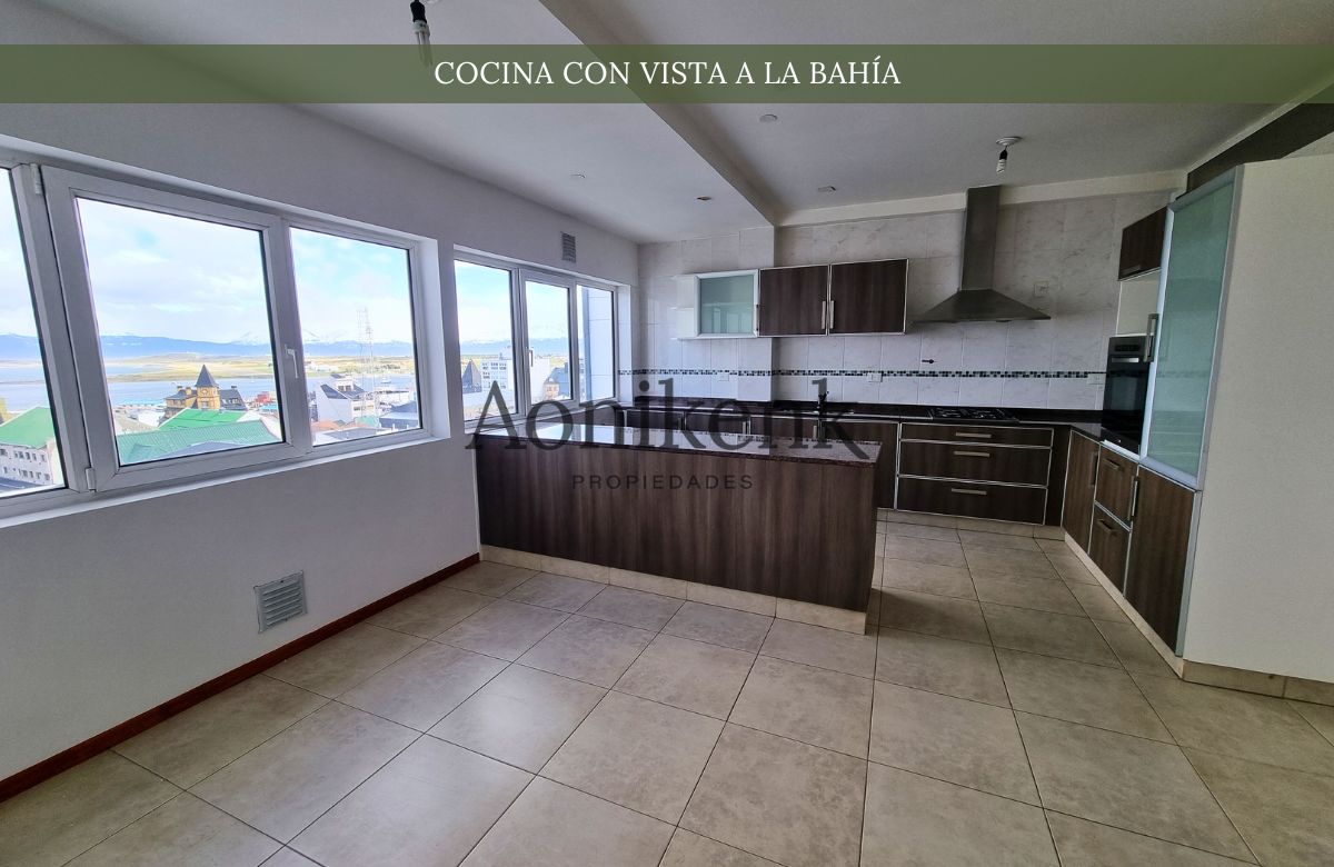 ?? Cocina con barra desayunadora, bajo mesada, alacena y horno a gas. Con una vista increíble a la bahía.